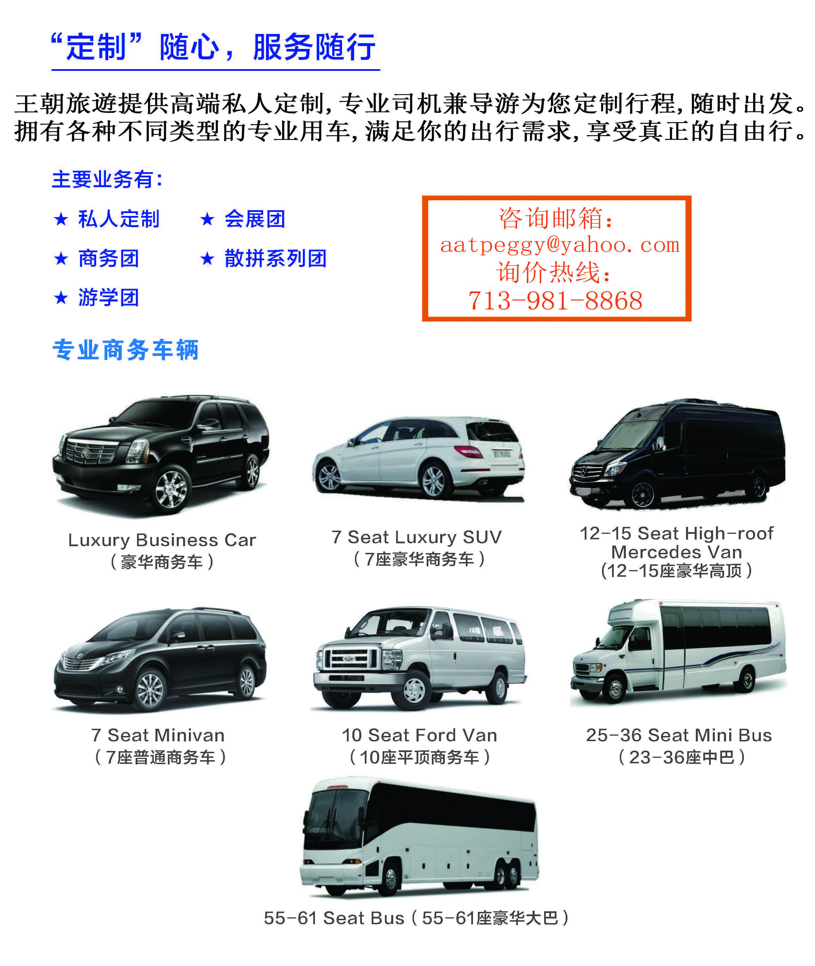 王朝旅遊一直專業代客辦理全球簽證, 包括商務、旅遊、探親, 訪友等各種類型簽證及代辦全球認證、公證服務。 聯繫電話:713-981-8868 聯繫郵箱:allamericatravel@yahoo.com